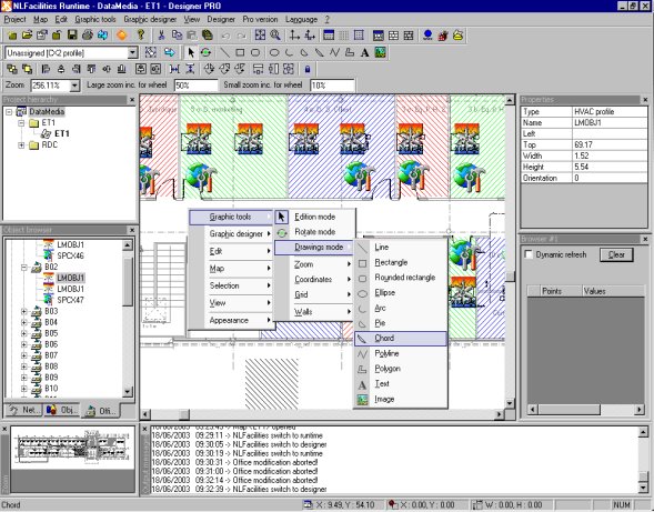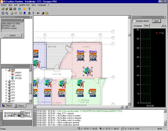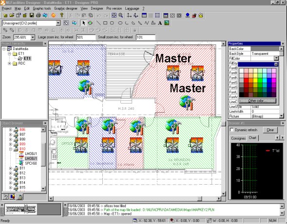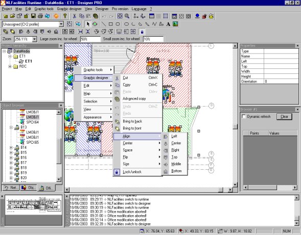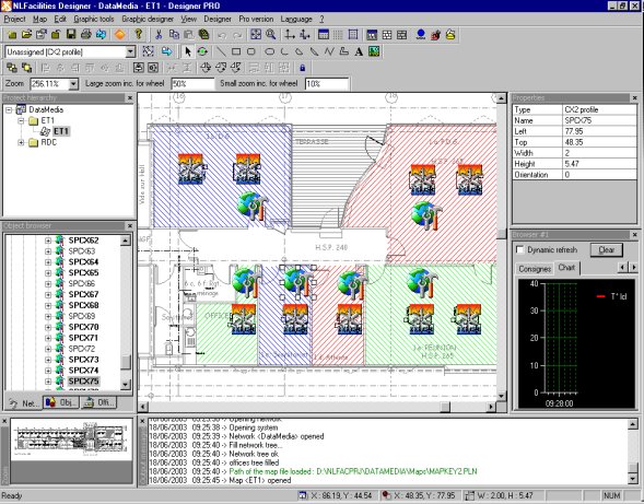 NLFacilities offers a powerful MetaDraw based graphics editor allowing individual management of each site plan. The developer imports the outline plan, defines the equipment graphics, inserts and positions the equipment on the plan, adds on any drawn elements required and finally defines possible positions for partitions. The developer and the user have advanced graphics functions, an analog or zone zoom, an automatic scale up or down and cut and paste graphics. In addition, the developer has a full range of drawing functions : alignment, rotation, symmetry, spacing, multi selection, etc. Once the space has been defined in the Designer, the user can then exploit the building. Partitions can be added or taken out and NLFacilities will automatically rejig the new living space. In addition, equipment network variables can be visualized and plug ins made.