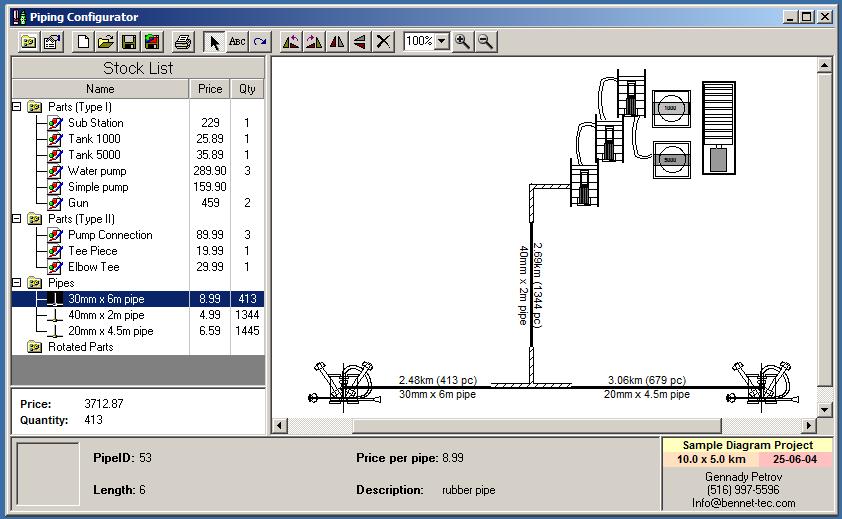The Piping Configurator was created by Bennet-Tec as a custom project using both TList and MetaDraw The project was created for both Web use and also as a stand-alone EXE desktop application. The Piping Configurator project allows the user to construct a schematic diagram of connected system components by dragging the elements from the display in the TList ( Tree / Grid ) control and dropping into the diagramming area provided by the MetaDraw control. The user can also drag elements around within the diagram. Piping connections are automatically maintained by MetaDraw, and the length of pipe is automatically calculated. As the configuration is built, the parts used and pipe length used are updated in the TList dislay, and the project cost is automatically calculated. Double clicking items in the Stock List highlights the associated objects in the schematic. Double clicking objects in the schematic highlights the associated item in the Stock List.