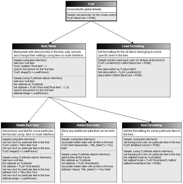 This diagram shows how to access TList data structures holding tree data and formatting.